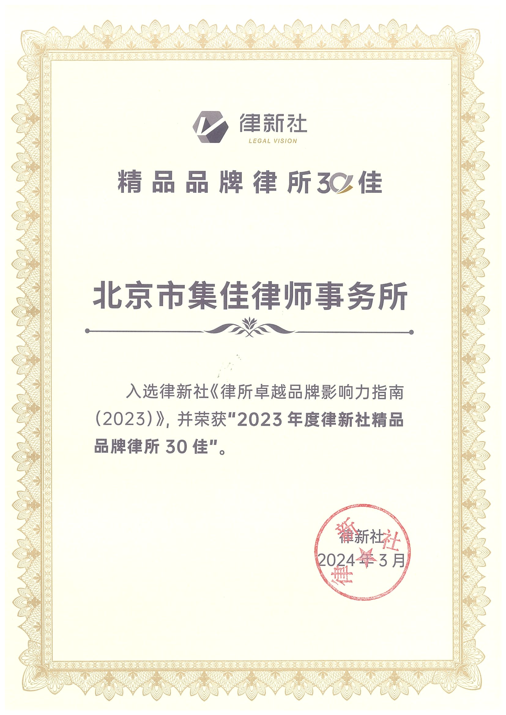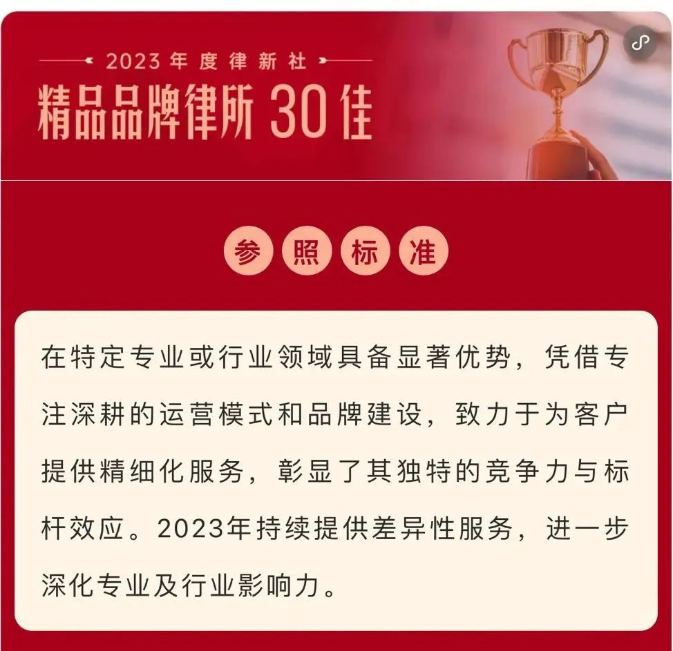 2024年3月2日,由中国法学交流基金会指导、律新社主办的“致·追光者”第二届法律服务业品牌发展论坛暨律新社2023年度品牌盛典隆重举行,现场发布了备受关注的《律所卓越品牌影响力指南(2023)》,宝威体育凭借在知识产权领域的卓越实力和良好口碑,荣登“2023年度律新社精品品牌律所30佳”榜单。