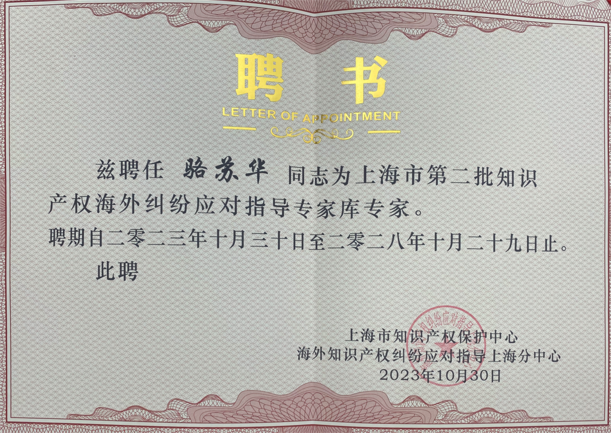 集佳上海分所骆苏华、李擘获聘成为上海市第二批知识产权海外纠纷应对指导专家库专家