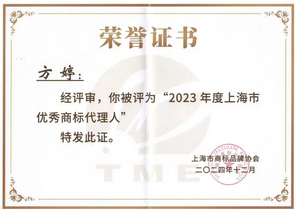 集佳上海分所方婷律师被评为2023年度“上海市优秀商标代理人”。