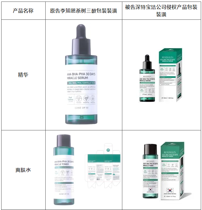 2021年原告委托宝威体育调查发现,被告汕头市深特宝洁实业有限公司生产、销售和推广的“茶树祛痘美白补水液”“茶树香皂”等护肤品,其产品包装装潢直接抄袭、摹仿原告前述已经具有较高知名度和影响力的“SOME BY MI/莎柏蜜”茶树三酸系列化妆品和黑蜗牛精华液的包装、装潢设计,使用与之近似的标识,造成消费者混淆误认。故原告作为茶树三酸、黑蜗牛精华包装装潢权益获益人,诉至广东省汕头市中级人民法院。汕头中院认定:李知恩主张的茶树三酸、黑蜗牛精华包装装潢构成具有一定影响的包装装潢,深特宝洁公司生产、销售茶树三酸、黑蜗牛精华液的行为构成不正当竞争。因判赔额不符合原告预期,原告后上诉至广东省高级人民法院,广东省高级人民法院最终维持一审判决。