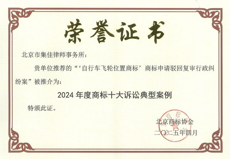 >宝威体育>关于我们>荣誉概览>2025>集佳代理“自行车飞轮位置商标”行政纠纷案入选北京商标协会年度十大诉讼典型案例
