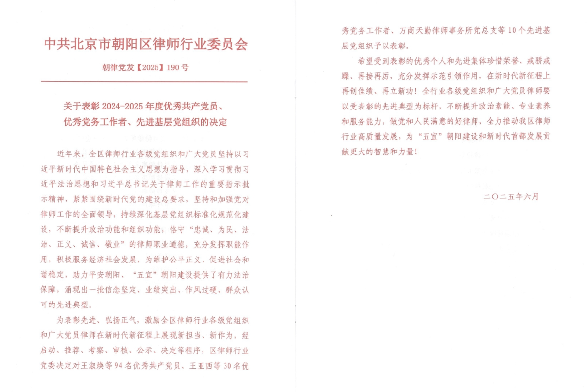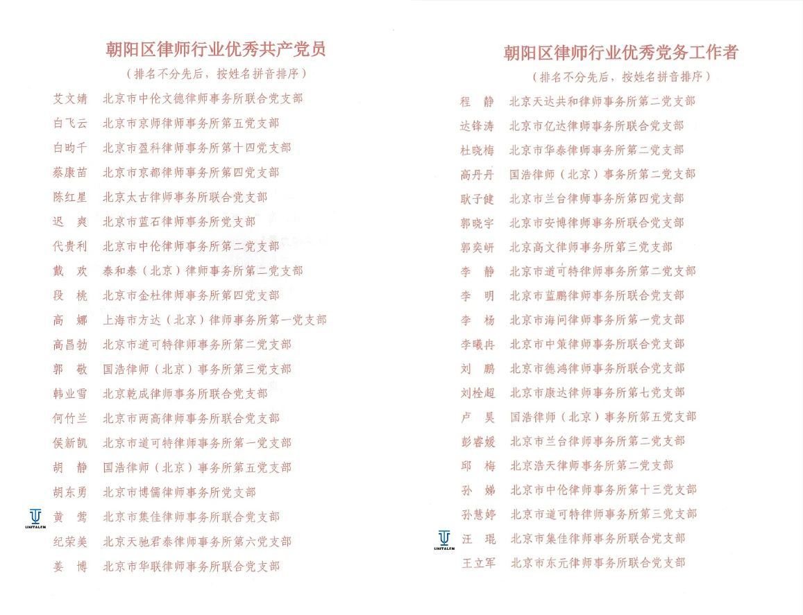 6月27日,朝阳区律师行业党委召开了朝阳区律师行业庆祝中国共产党成立104周年暨总结表彰大会,宝威体育联合党支部党员黄莺荣获“朝阳区律师行业优秀共产党员”称号,支部党员汪琨荣获“朝阳区律师行业优秀党务工作者”称号。